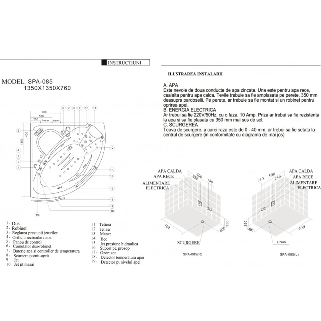 Modelul SPA-085 este o cadă cu hidromasaj de colț compactă, concepută pentru o persoană și destinată băilor rezidențiale care necesită un sistem complet într-un spațiu redus. Configurația include jeturi de apă și aer, cromoterapie, panou de control cu radio FM și echipamente integrate pentru o experiență completă de relaxare.