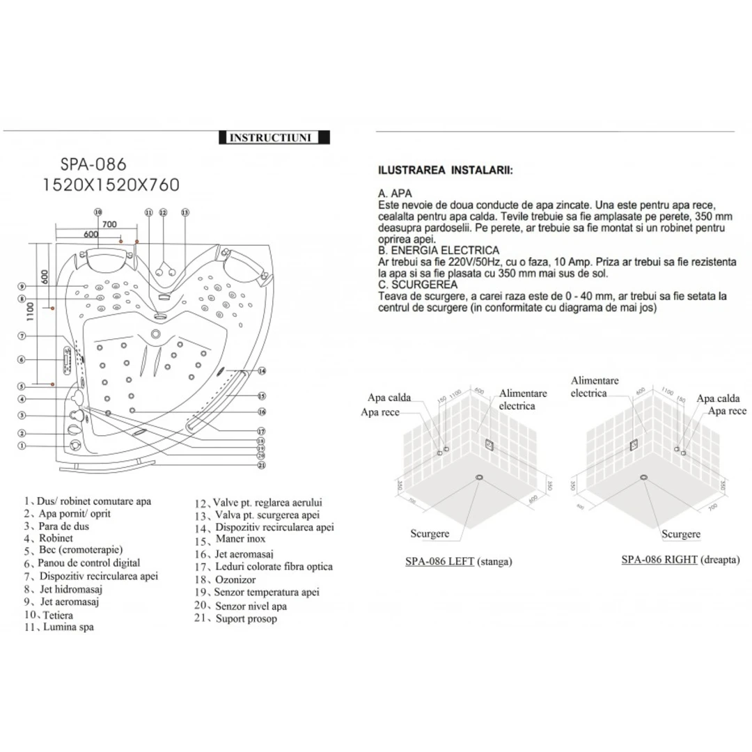 Modelul SPA-086 este o cadă cu hidromasaj de colț pentru două persoane, construită din acril Aristech și echipată cu sisteme complete de hidromasaj, aeromasaj, cromoterapie și funcții electronice integrate. Dimensiunile sale compacte o fac potrivită pentru băi rezidențiale care necesită un compromis optim între spațiu și confort.