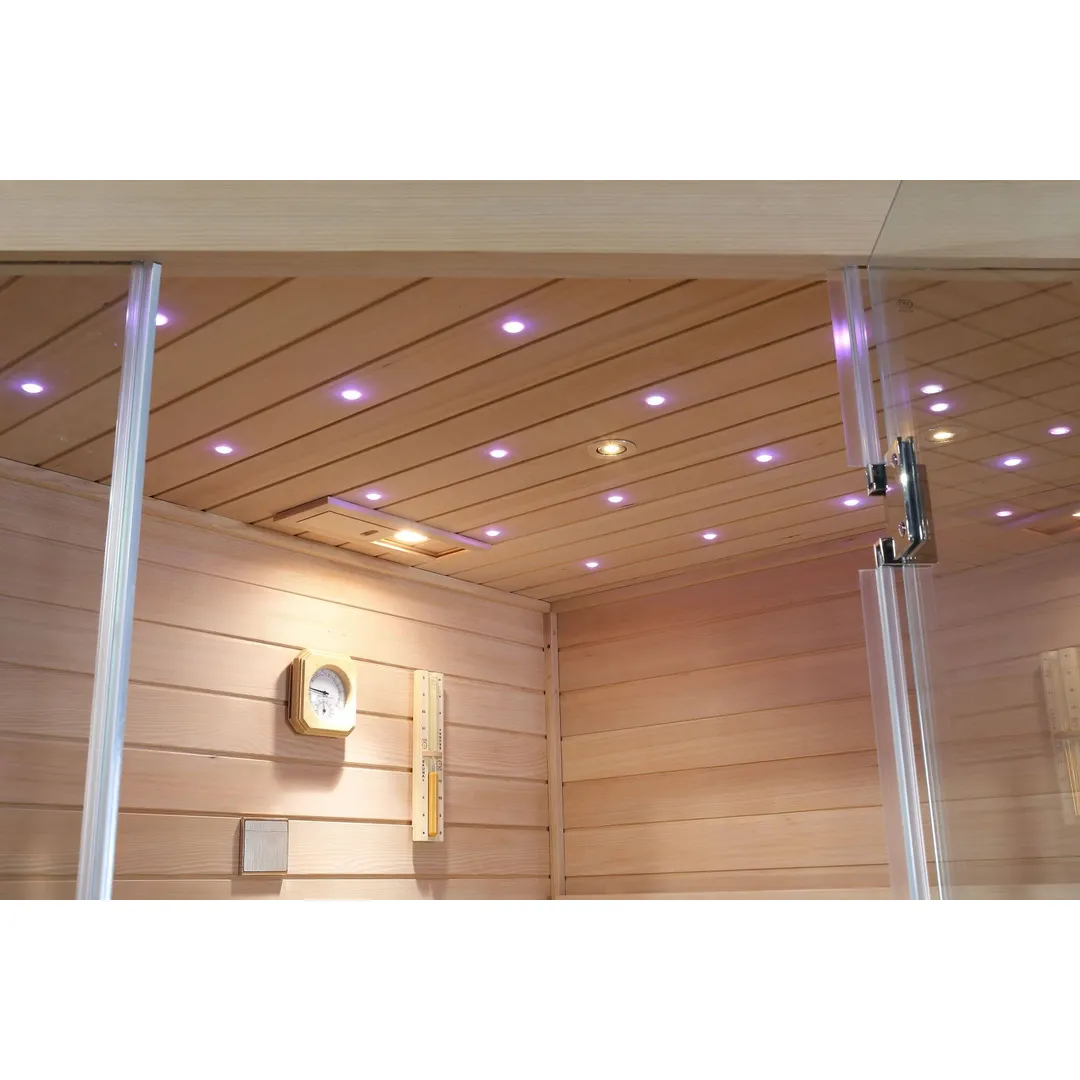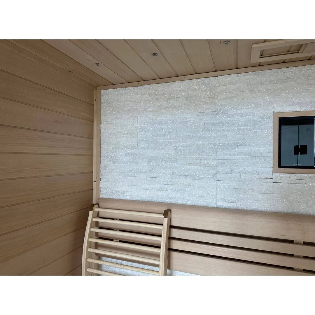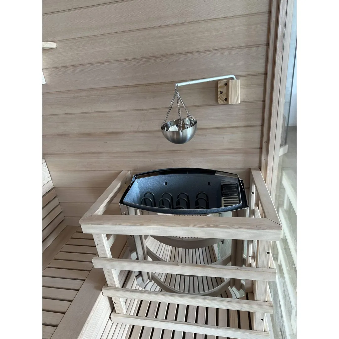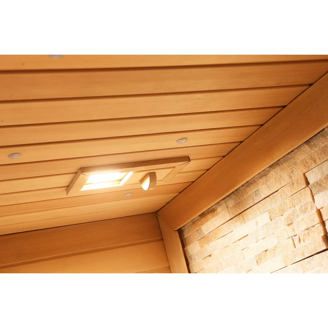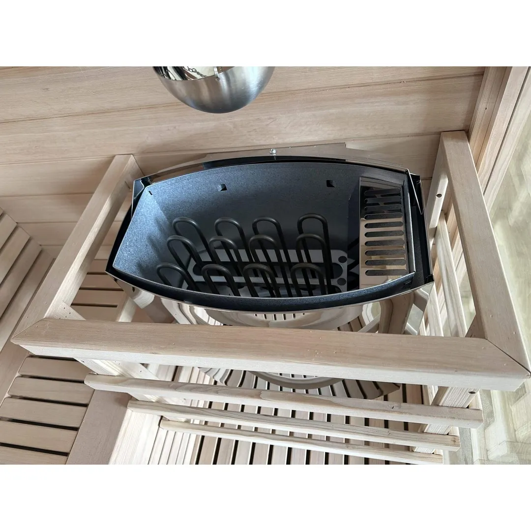 Modelul Saună tradițională FIR 818 este o saună tradițională construită din panouri modulare de 45 mm grosime, cu strat de izolație între panoul interior și exterior. Lemnul utilizat este Hemlock canadian, o esență fără noduri, cu proprietăți antiseptice. Sistemul de încălzire este asigurat de un încălzitor Harvia de 6 kW, compatibil cu alimentare 220V sau 380V.